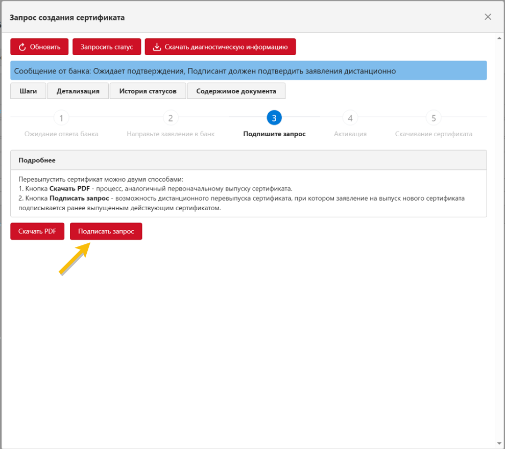 - Если у пользователя был ранее активированный сертификат и банк вернул соответствующий статус, то при запросе сертификата будет доступна кнопка