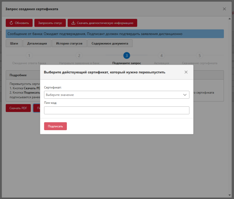 Перевыпуск — у пользователя есть ранее выпущенный и активированный сертификат. Подтверждение запроса возможно двумя способами: электронная подпись предыдущим сертификатом (удалённо) или физическое предоставление PDF в отделение банка, как при первичном выпуске.