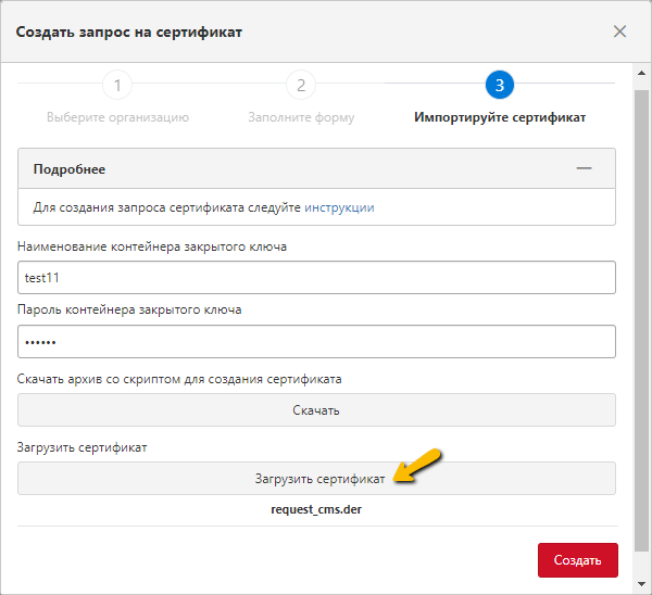 Загрузка сертификата Далее необходимо нажать на кнопку