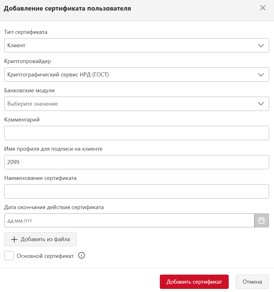 Добавить сертификат, заполнить поля:Тип сертификата- значением “Клиент”;Криптопровайдер- значением “Криптографический сервис НРД (ГОСТ)” / “Криптографический сервис НРД (RSA)";Имя профиля для подписи на клиенте- ввести имя профиля;