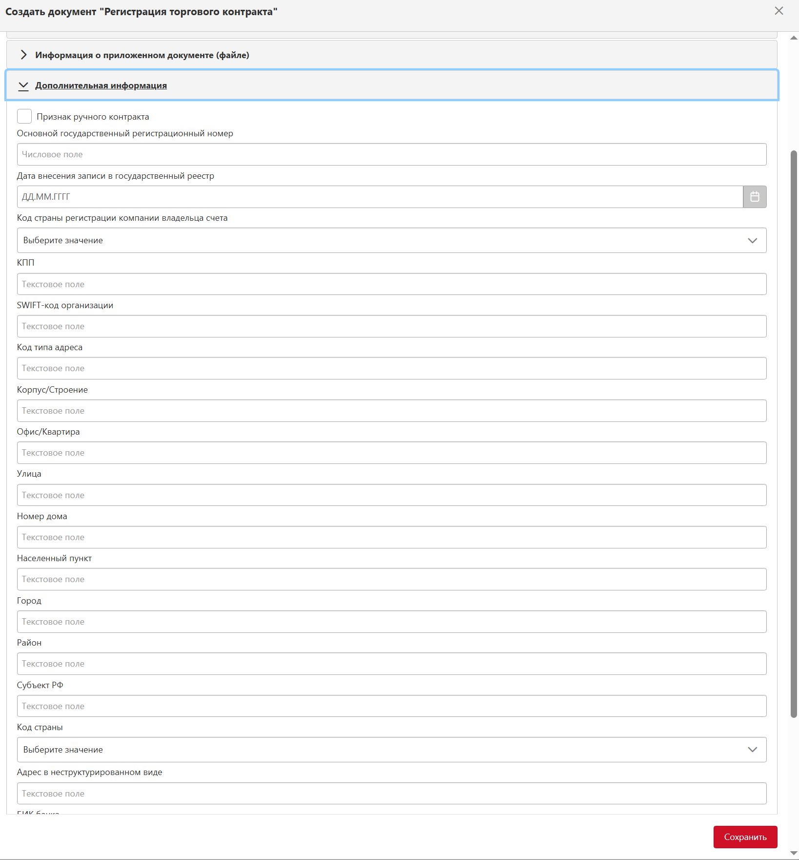 возле наименования. Если хотя бы одно поле в блоке заполняется автоматически, блок раскрывается. Чтобы свернуть блок также необходимо нажать на наименование блока или значок