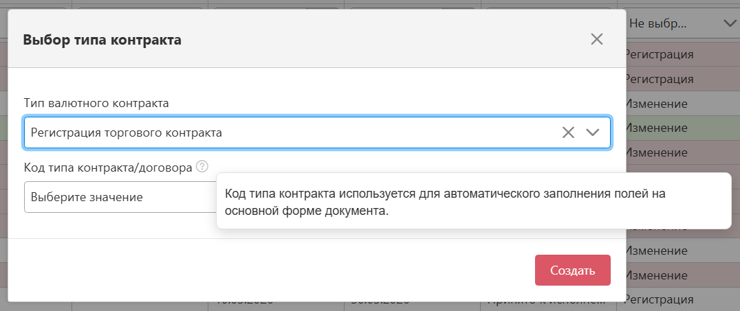 Если при создании Валютного контракта был выбран тип Регистрация торгового контракта, на модальном окне отобразится поле Код типа контракта/договора. Это поле обязательно для заполнения для всех банков. После заполнения поля Код типа контракта/договора и нажатия кнопки “Создать”,