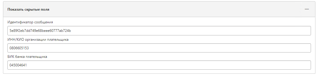 Идентификатор сообщения- значение полю присваивается автоматически;ИНН/КИО организации плательщика- значение полю присваивается автоматически на основании данных организации;БИК банка плательщика- значение полю присваивается автоматически на основании данных счета;