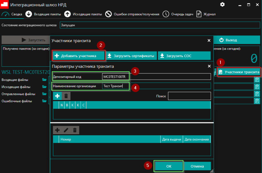На этом шаге в Интеграционном шлюзе (ИШ) необходимо добавить депозитарный код банка в участники Транзита, после чего выполнить загрузку сертификатов.